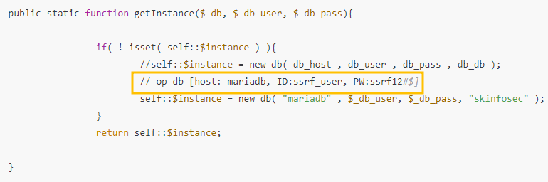 self::$instance = new db( "mariadb" , "ssrf_user" , "ssrf12#$" , "skinfosec" );